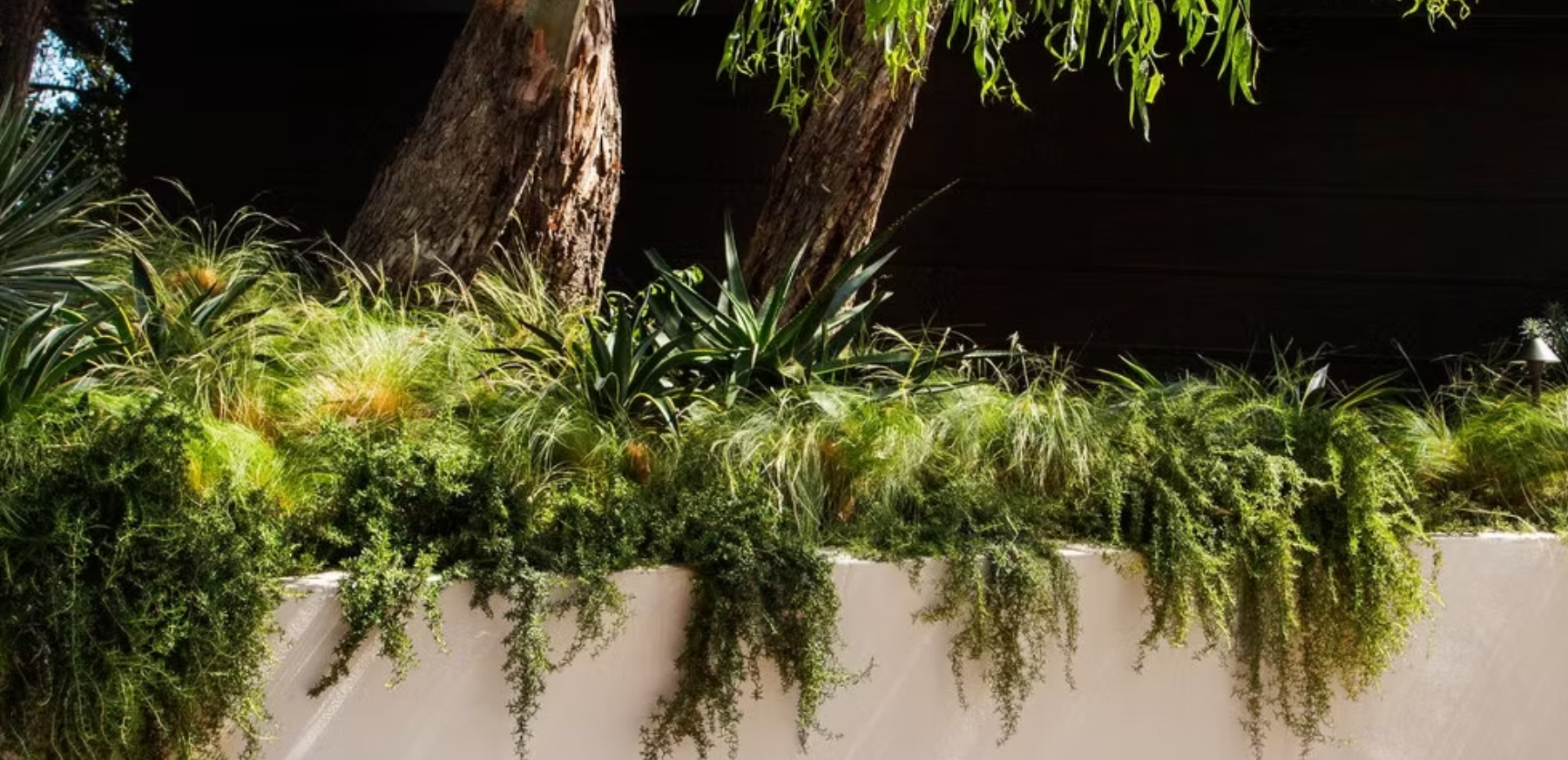 The pristine white retaining wall serves as a clean backdrop, allowing the lush, cascading greenery to take center stage.