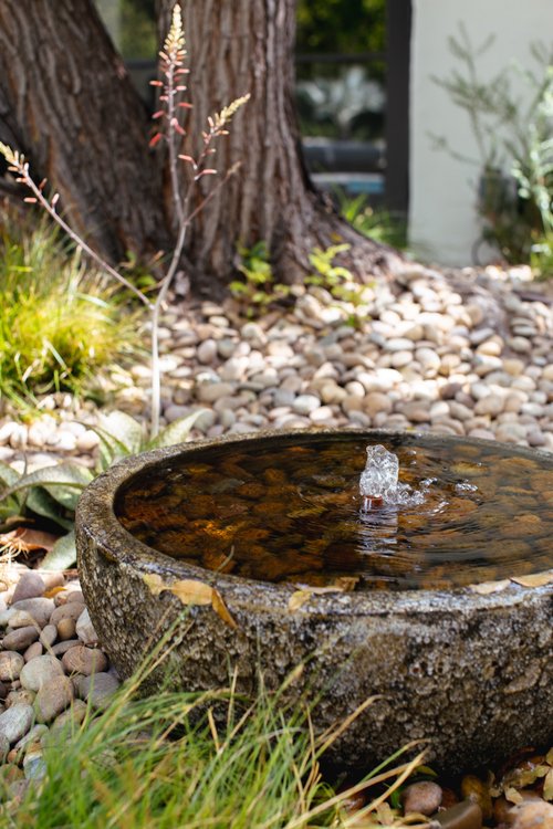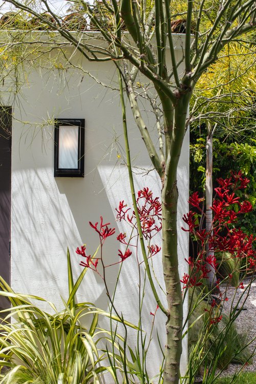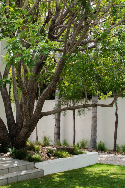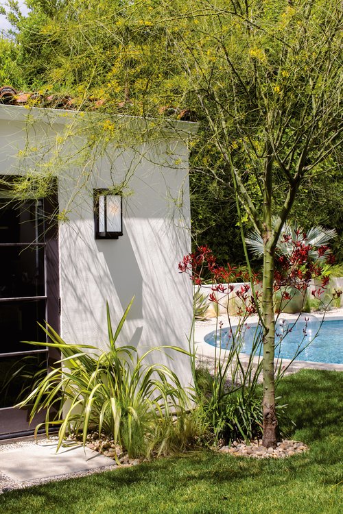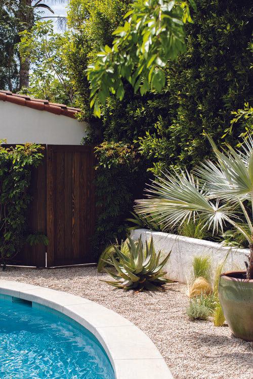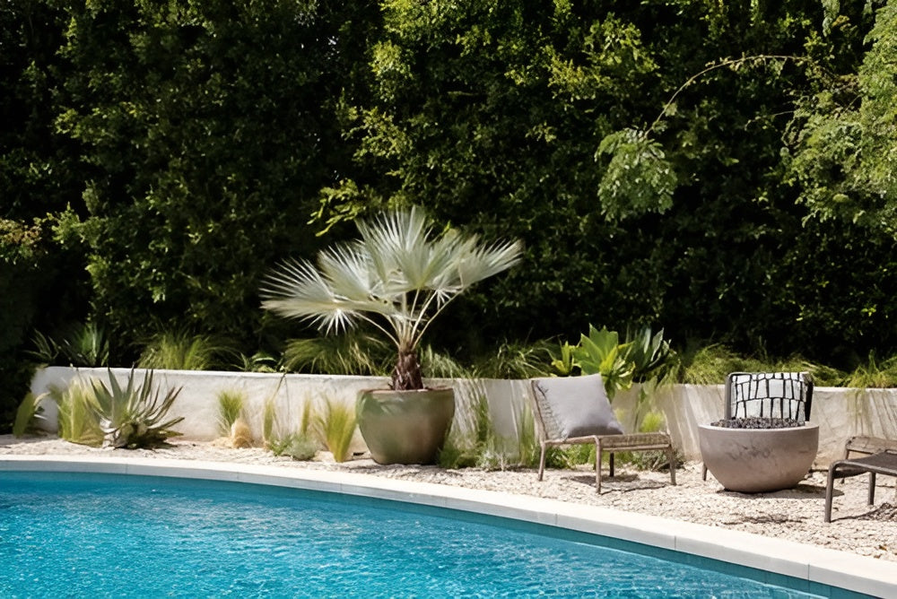 The entire landscape seamlessly integrates with the pool's design, crafting a peaceful oasis perfect for unwinding and entertaining.