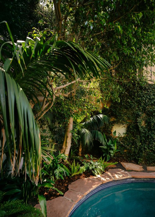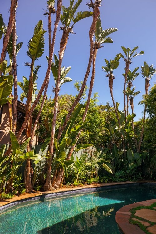 The front garden features drought-tolerant plants and ornamental grasses, offering natural beauty and low-maintenance appeal. The backyard pool area, framed by towering tropical plants, provides a serene retreat. T