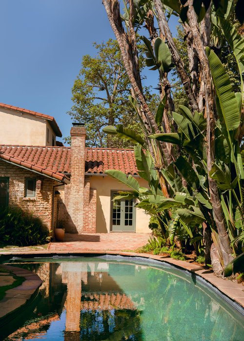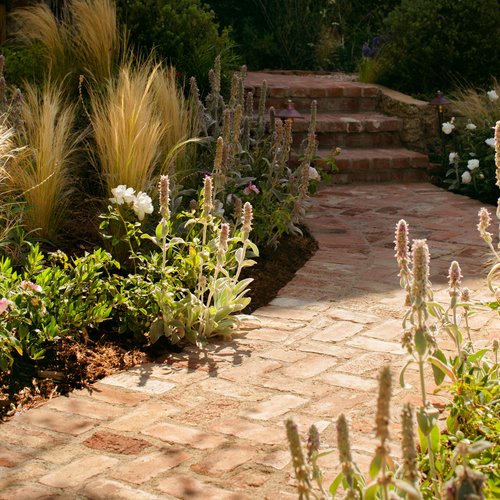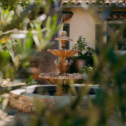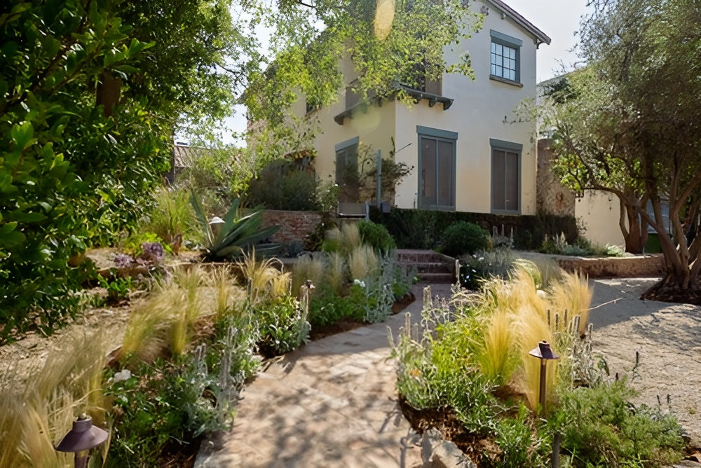 his landscape blends traditional Mediterranean elements with Southern California's vibrant flora, creating a peaceful and elegant outdoor haven.