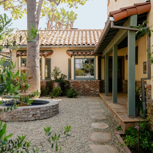 This charming Pacific Palisades home beautifully integrates Mediterranean-inspired design with the Southern California landscape. The courtyard welcomes you with classic terracotta tiles and rustic brickwork, evoking an authentic Mediterranean feel. A stone pathway leads to a grand fountain surrounded by lush greenery and vibrant potted plants, enhancing the tranquil ambiance.