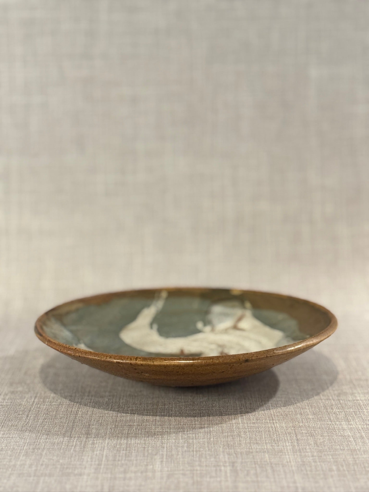 This striking hand-thrown stoneware bowl is a beautiful example of mid- to late-20th century studio pottery, blending rustic craftsmanship with expressive modernist design. The shallow, wide-mouthed form is skillfully shaped and finished with a rich earthy glaze in deep olive and brown tones, accented by bold abstract white brushstrokes that sweep across the interior. The surface texture and intentional asymmetry evoke a wabi-sabi aesthetic — celebrating imperfection and the natural beauty of handmade work.