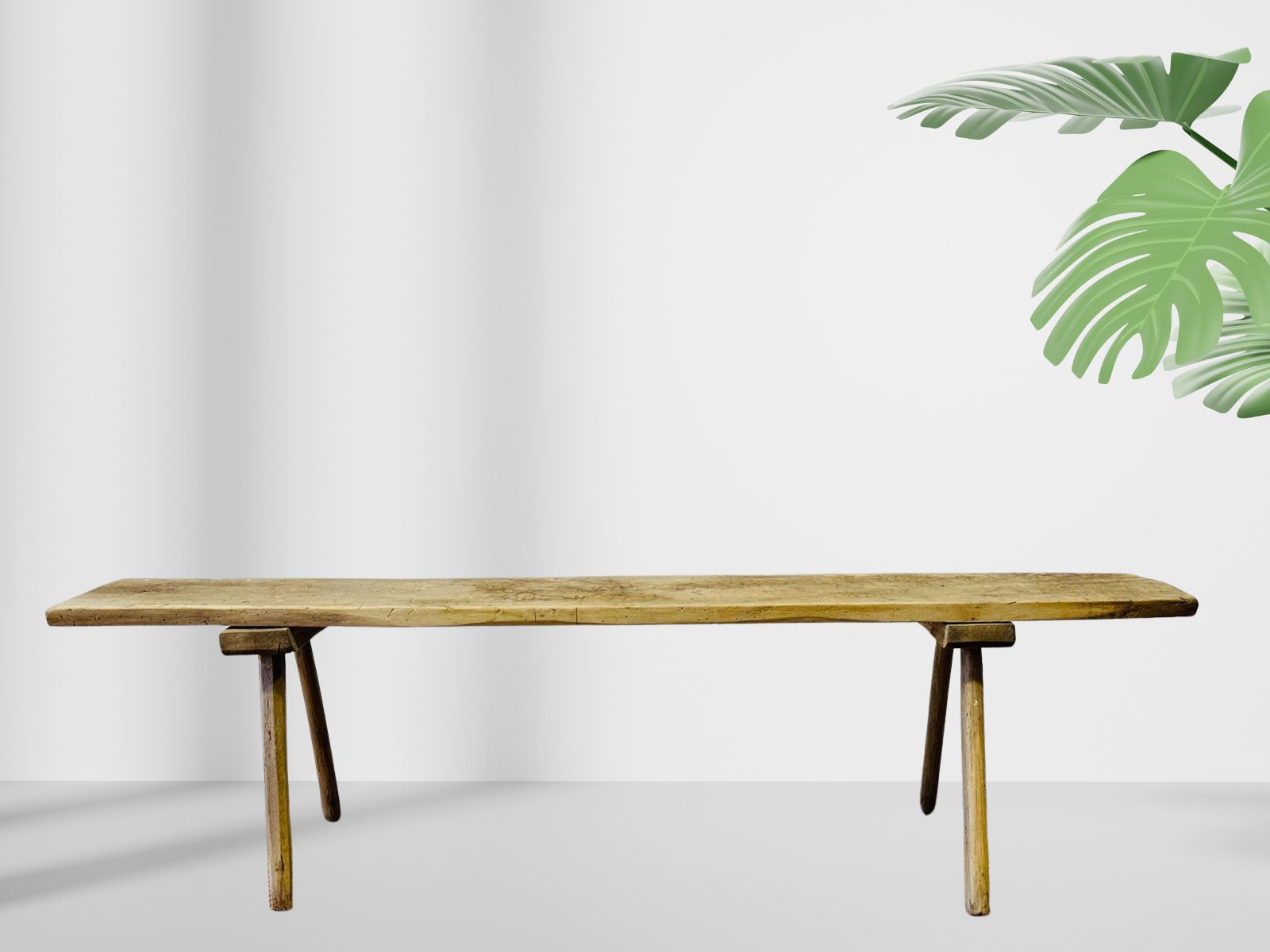 A rare and character-rich antique European butcher’s bench, beautifully aged and bleached to highlight its organic textures. Crafted from solid wood with a naturally worn patina, this primitive three-legged bench was originally used for traditional hog butchering, repurposed into a striking console or seating piece. The hand-hewn slab top and sturdy, splayed legs embody rustic craftsmanship, making it a unique addition to farmhouse, wabi-sabi, and minimalist interiors.