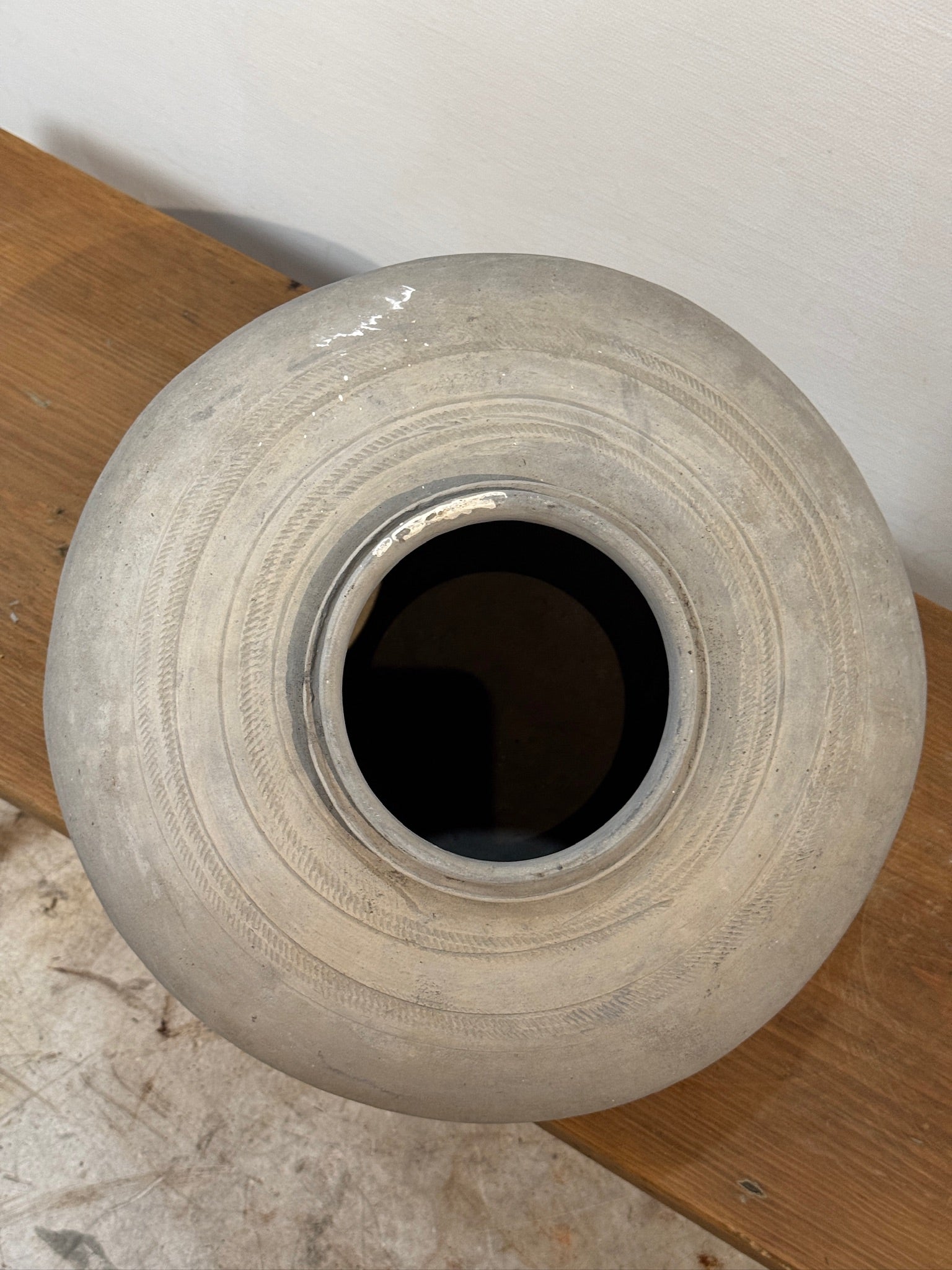 This antique French terracotta pot boasts a beautiful aged patina with a raw, unglazed surface. Its timeless design features subtle hand-carved detailing near the rim, adding character and texture. The natural wear and weathering give it a unique rustic charm, making it a versatile decorative piece. This pot would make an excellent addition to any vintage, farmhouse, or minimalist decor.
