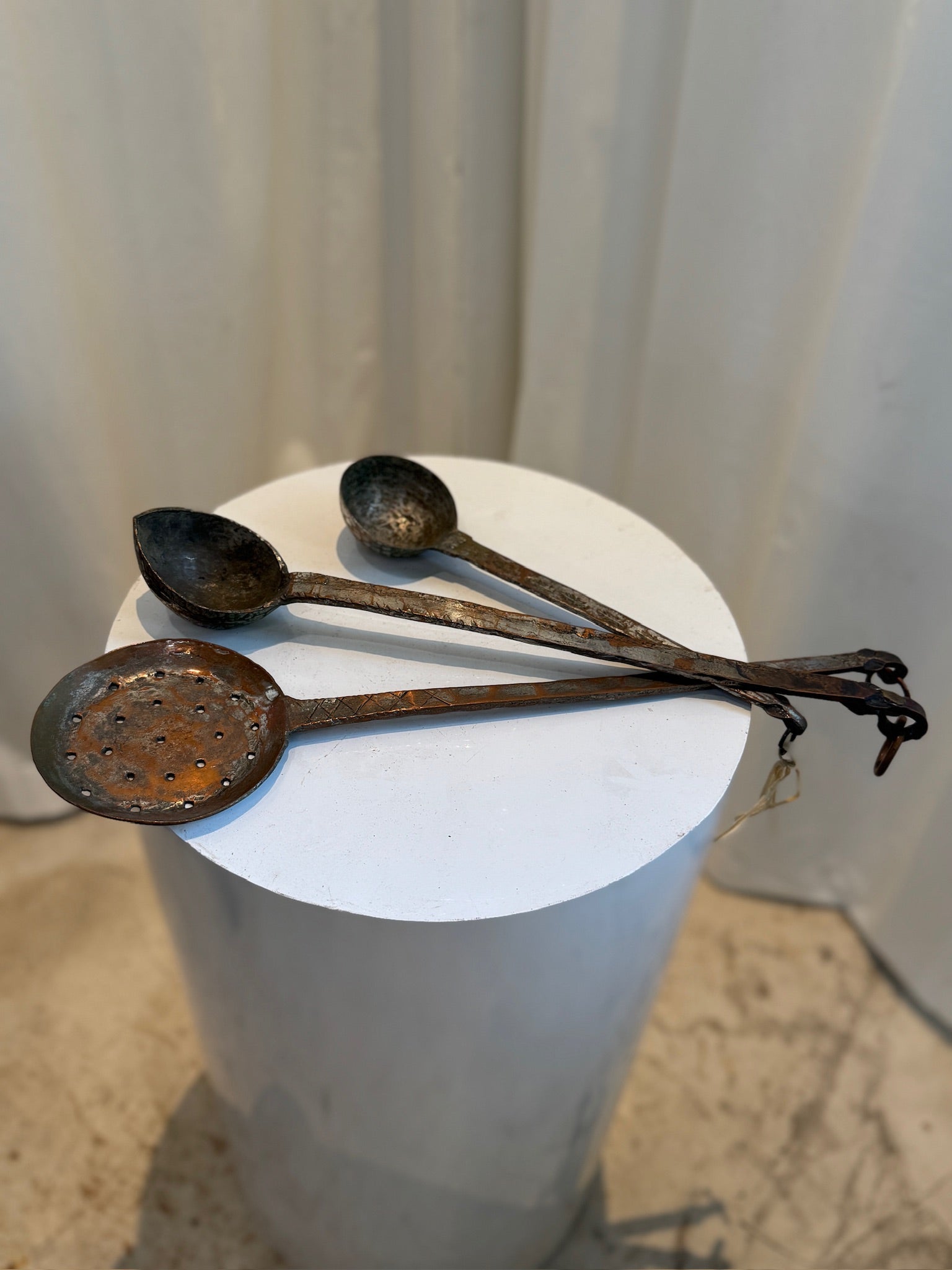 These ladles are perfect for collectors, chefs, or those who appreciate authentic antique kitchenware. Their worn texture and hand-hammered details speak to their history and functional use in open-fire cooking.