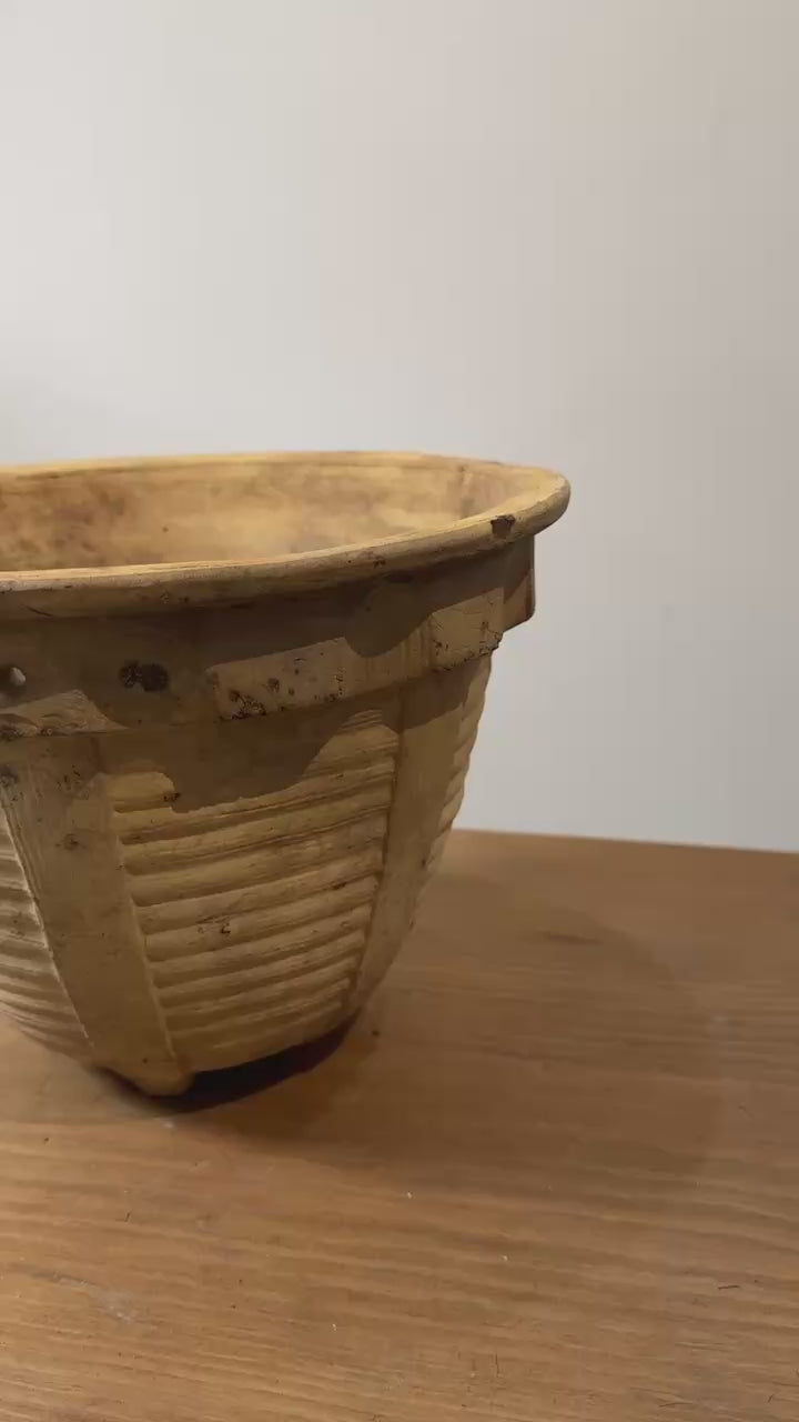 This antique European terracotta planter, originally used as an olive jar, boasts a beautifully aged patina and intricate ribbed geometric relief detailing. Hand-thrown and featuring a natural weathered finish, this planter exudes rustic charm and authenticity. Its substantial form, with reinforced ridges, suggests durability and craftsmanship typical of Mediterranean or Spanish pottery traditions.