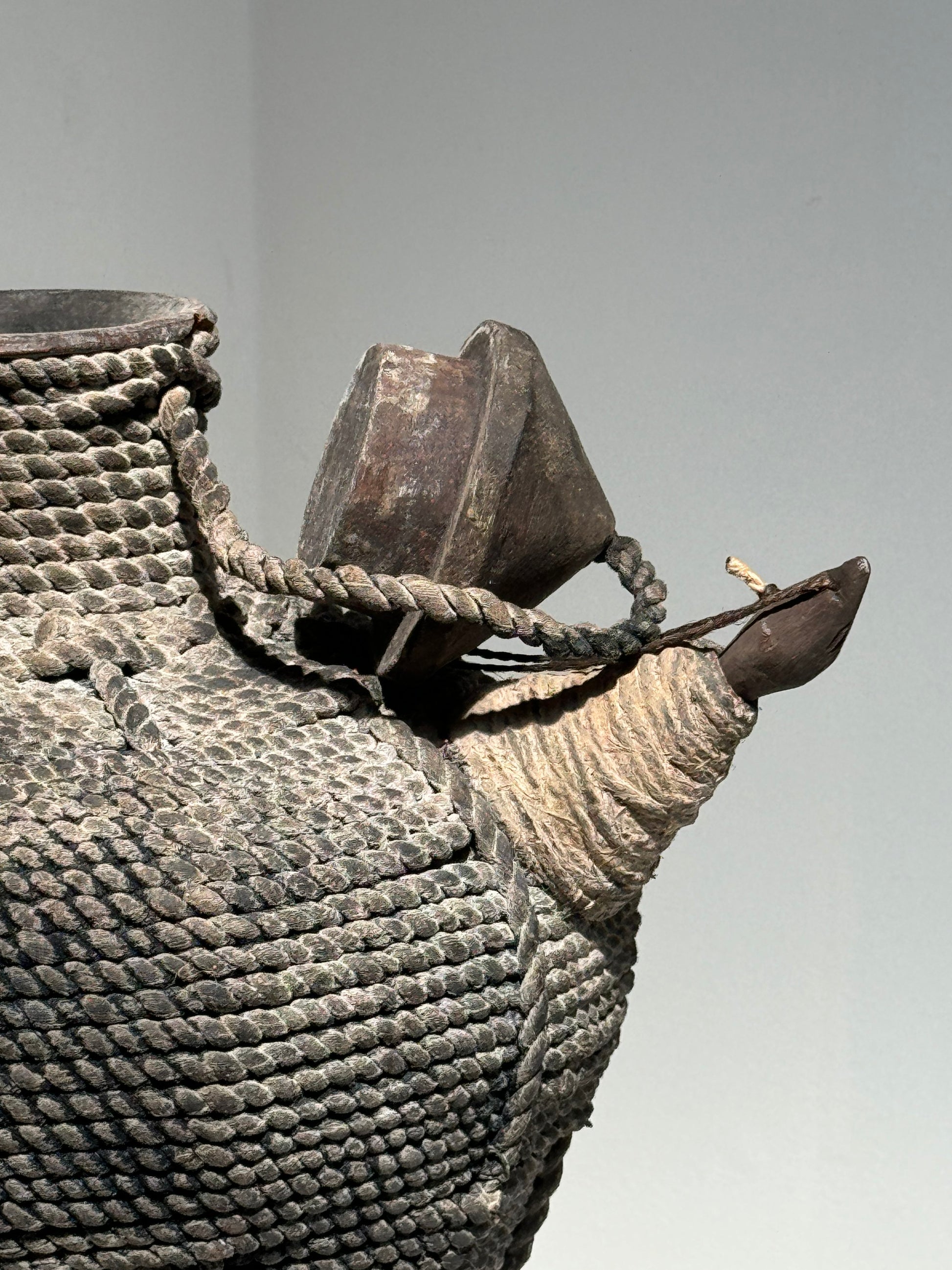 The black and brown antique Southeast Asian Kendi water pot is a cultural treasure. Crafted with wood and rattan, it's a symbol of Southeast Asian artistry. Used historically in ceremonies and daily life, it showcases the region's craftsmanship and cultural heritage.