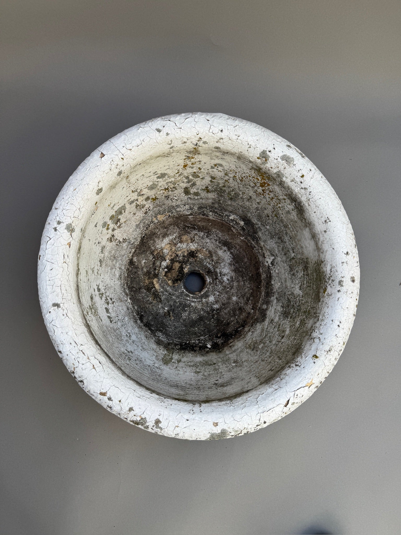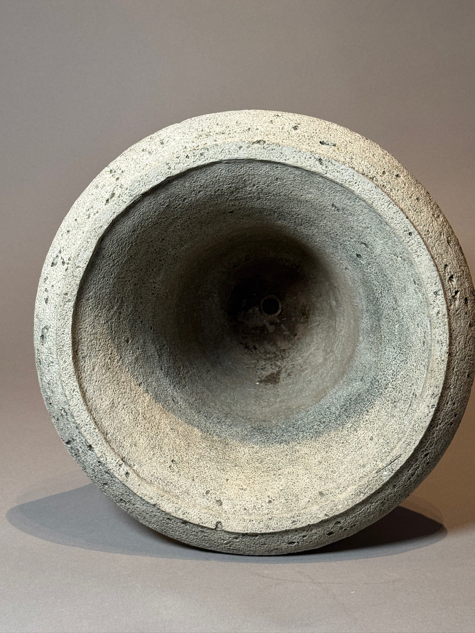Crafted from durable cast stone, this urn has developed a naturally aged weathered patina, showcasing subtle variations in gray and off-white tones, with an organic texture that enhances its historic charm. The surface bears the gentle marks of time, including textural pitting and natural wear, adding to its authenticity and character. A central drainage hole ensures functionality, making it ideal for outdoor floral arrangements or sculptural display.