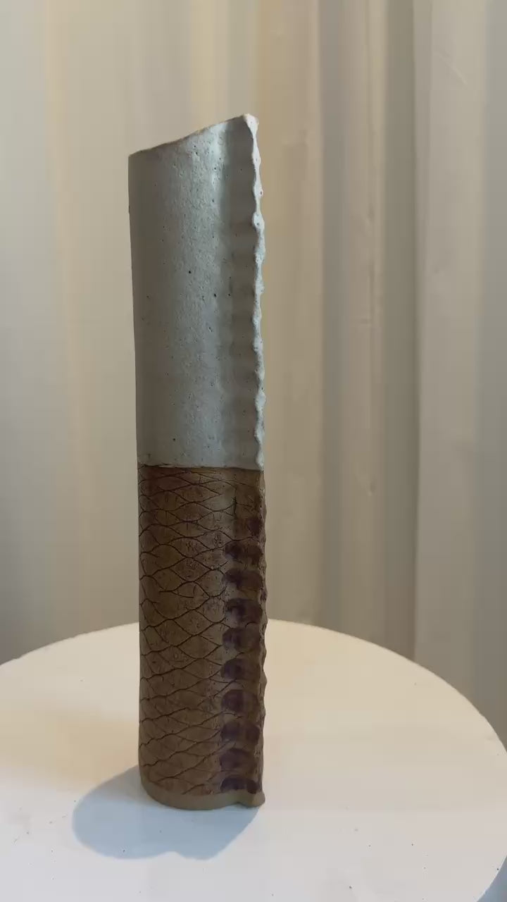 The vase showcases a tall, cylindrical form with an organically pinched and asymmetrical rim, creating a dynamic and expressive silhouette. The surface is divided into two distinct textures: the upper portion features a smooth, unglazed stoneware finish in muted gray, while the lower section is adorned with a rich brown, patterned surface reminiscent of reptilian scales or woven textures. A carefully sculpted ridge with indentations runs vertically along one side, adding depth and dimension to the piece.
