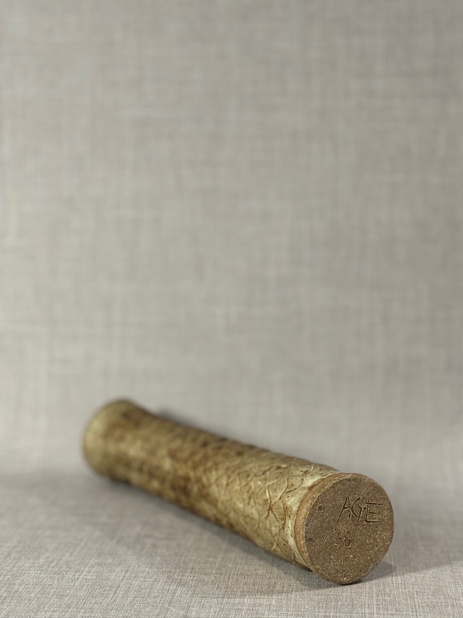 This tall studio pottery vase is a beautifully hand-thrown and glazed ceramic piece signed by the artist “A.G.E.” on the base. Measuring 10.6 inches in height and 2.25 inches in diameter, the vase presents a refined, cylindrical silhouette adorned with a meticulously carved fish scale relief pattern.
